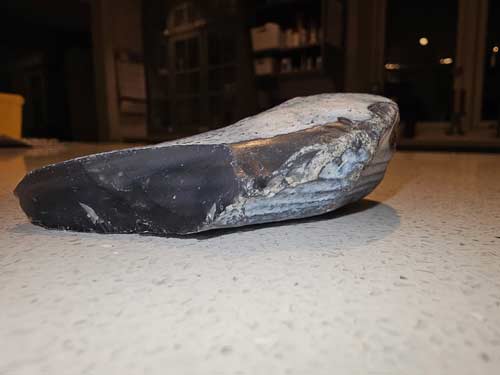 Vi vet ikke hva slags stein det er, men tror det er obsidian.