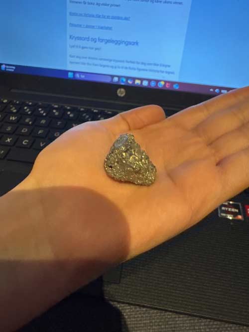 Steinen fant jeg i gruva i Foldvik parken. Den er spesiell for meg fordi den ligner på gull og meteoritt. Steinen heter pyritt. Mvh Dennis